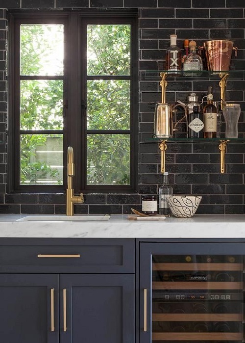 This deep blue kitchen cabinet will work quite well with vintage-themed houses. The mounted copper faucet surely adds a contemporary vibe and further brightens the area.