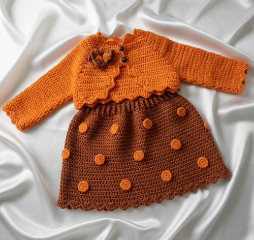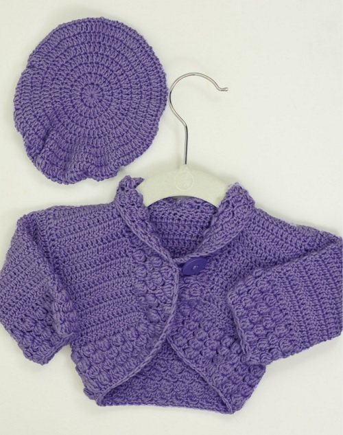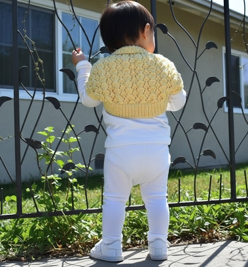 This baby bolero by Crochet-Crosia is a must-have for your little one’s wardrobe collection. The playful dotted design is the attractive feature of this wearable.