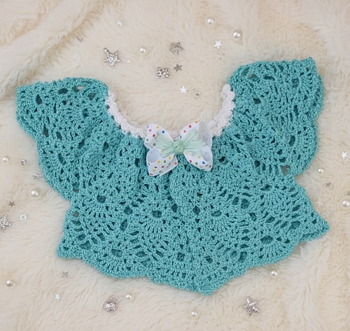 If your baby girl looks pretty in pink, this bolero by Majovel Crochet English is for you. It’s easy to throw on over a dress or onesie.