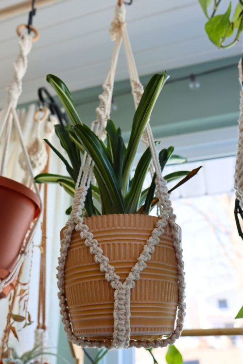 Look at this beautiful textured macrame plant hanger from Cami. It is super simple, only need to work on basic knotting techniques like lark’s head and double hitch knotting techniques.