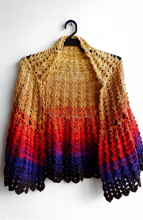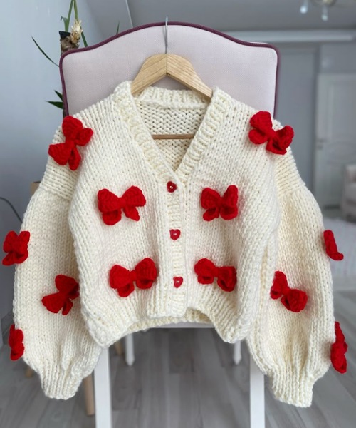 This beautiful winter cardigan is from Priya Crochets. It stands out with red bow motifs and intricate design. You can make one with a 4mm hook, medium-weight 5ply milk cotton yarn, and a darning needle.