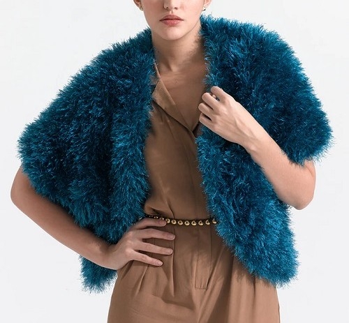 Try this stylish fur cap sleeve bolero from Lionbrand. You can wear it at any special occasion to spice up any boring outfit.