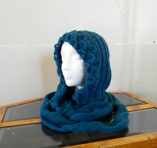 Look at this textured hooded scarf from Angels Handcrafted Gifts. It’s made from Sc, Dc, slst, and crocodile stitches. The crocodile scale edges are its key element.