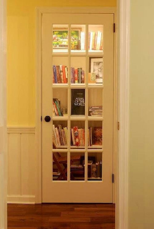 Install an overhead light, a glass door, and shelvings to modify a hall closet into a compact library.