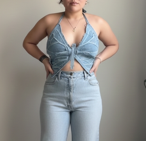 Paola Gonzalez is behind this gorgeous denim butterfly top. You only need old denim jeans and some sewing supplies to create this garment.