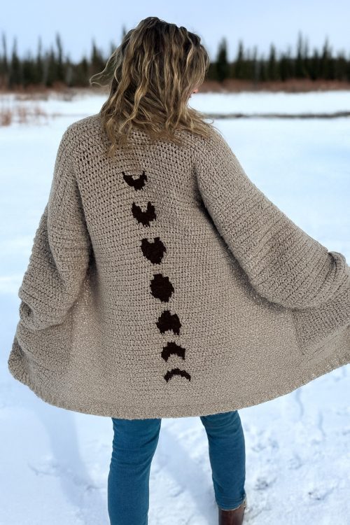 Lenka has created this beautiful celestial cardigan. The seven lunar moon phases on the back makes it an attractive addition to your winter wardrobe.