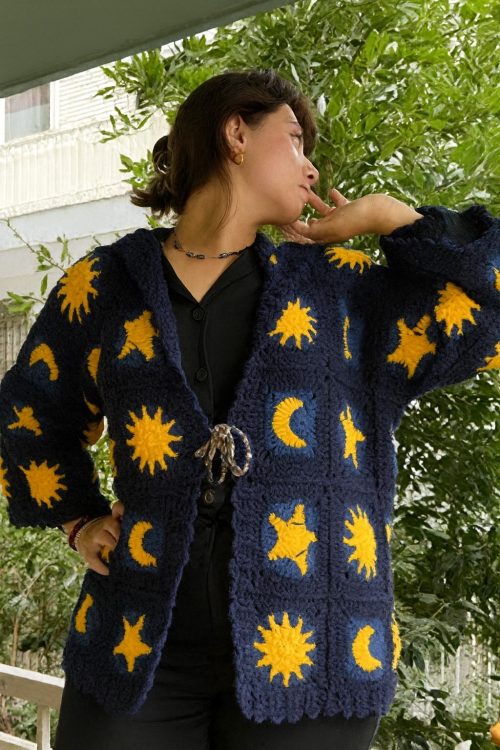 Try this amazing cosmic celestial cardigan from ÖRGÜ MÜ DEDİNİZ. The yellow Sun, star, and moon motifs are just outstanding.