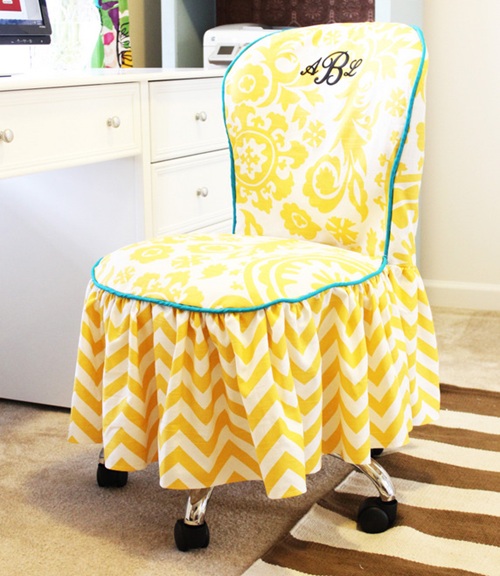 Try this office chair slipover from Amy. The ruffle pattern in the lower portion is the main attraction. It will give your boring chair a perfect, bright look, adding a touch of elegant, feminine flair to your workspace.