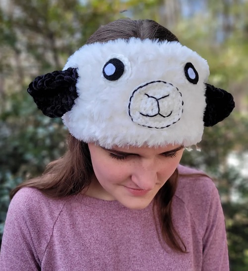 A soft and fluffy sheep ear warmer created by Jennifer. It has small 3D ears attached to a thick stretchy band that fits perfectly over your head without feeling too tight.
