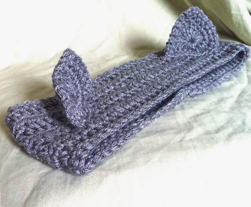 Ellie has created this crocheted ear warmer. All you need light weighted yarn, a 5 mm crochet hook, and a button. It is available in 3 different sizes.