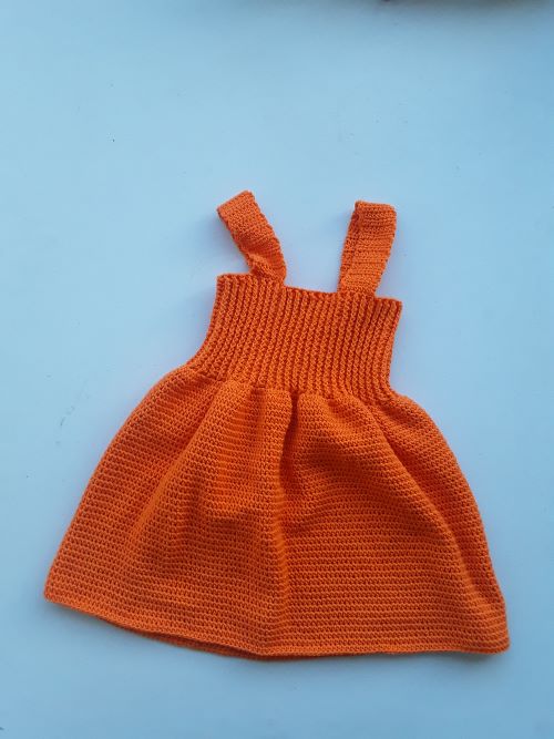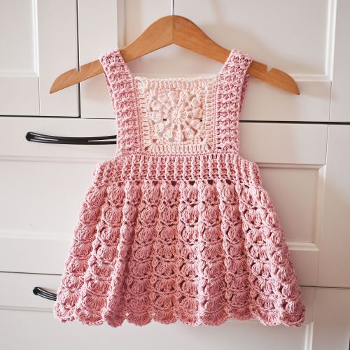 A perfect pink crochet baby girl dress by Veronika Cromwell. It has intricate details with a raglan-style design and a ruffled hem. Do check out now!