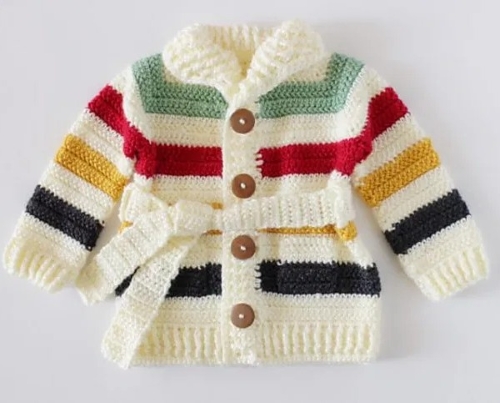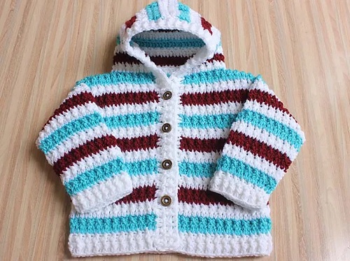 This adorable cardigan jacket comes with a hoodie and lovely stripes. The front button style makes it easy to put on and take off. Check the complete instructions by Crochet Crosia Home.