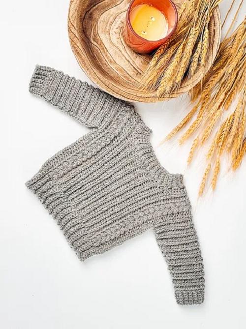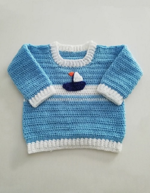 This cozy pullover by Crochetforyoublog is perfect for keeping your babies warm during those chilly evening walks. It features a cute sailing boat on the blue stitches.