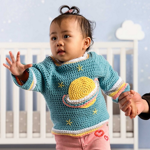 Love planets! Then crochet this baby pullover by Yarnspirations, which features a little Saturn. The unique celestial design will surely capture a lot of attention.