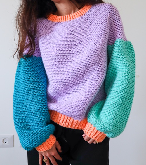 Look at this colorful sweater with loose and elegant sleeves by Lisahand! You’ll definitely love the hues and coziness of this winter wearable.