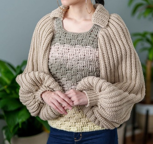 The basketweave design in the center and ribbed texture make this cropped sweater a unique addition to this list. You can easily pair it with high-waist pants or shorts. Check TCDDIY for complete instructions.