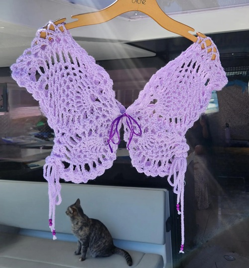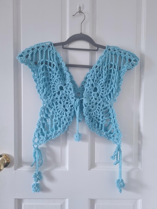 The Yarn Florist is behind this delicate crochet piece. Its soft blue hue and butterfly design make it perfect to wear over a casual tee or dress.