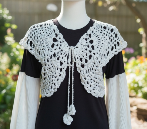 All you need is a soft cotton yarn and a 6.00 mm hook to create this butterfly boloero by Zaen’s Craft Studio. The floral string detail on the front makes it stand out.