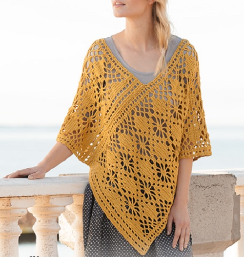 This crocheted poncho by Garnstudio is light and pretty. It features a floral motif design with a lace pattern. Check out the complete instructions for free.