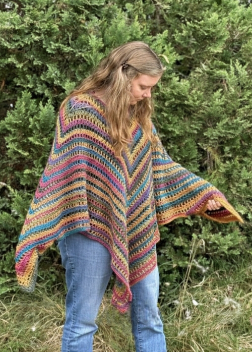 Mistie Bush is behind this not-so-cozy, stylish layering option. The moment this poncho is fully stretched, it gives the illusion of butterflies lifting into the air.