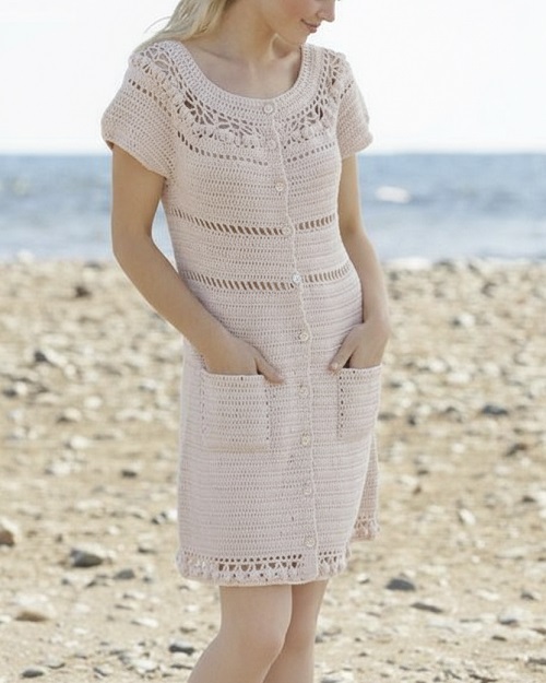 Do you want a lightweight cardi dress for mild chilly weather? Then try this one from Garnstudio. It has a lacey texture with two small pockets and an intricately patterned hem.