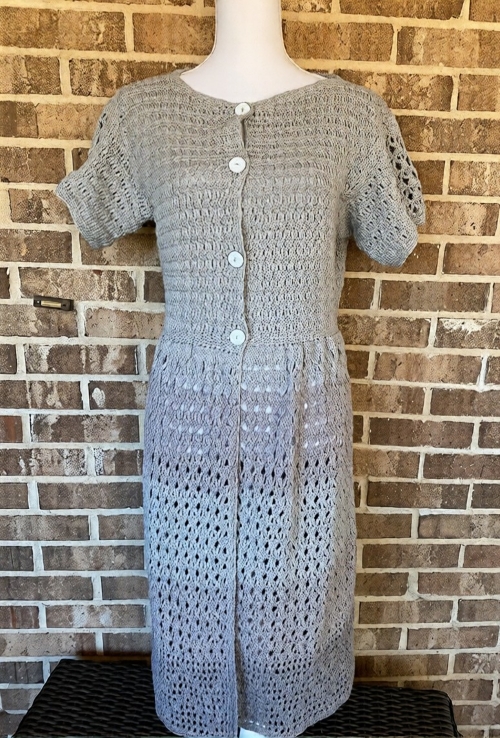 Take a look at this stylish winter cardigan dress from Pam. It’s made from chain, single crochet, half double crochet, slip stitch, and dc2tog stitches.