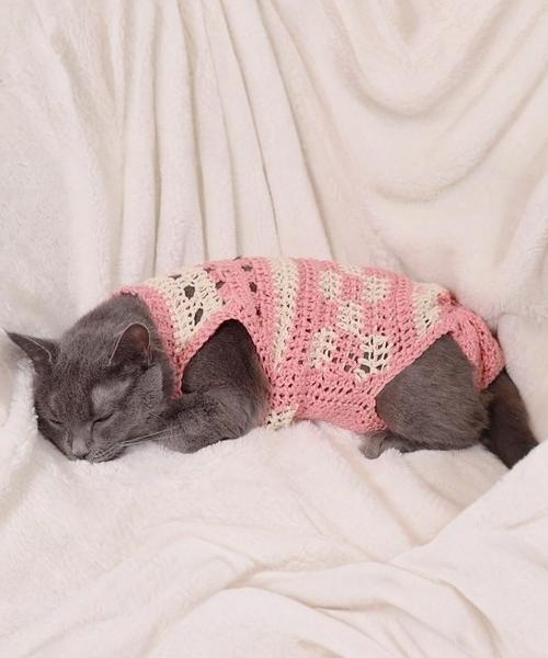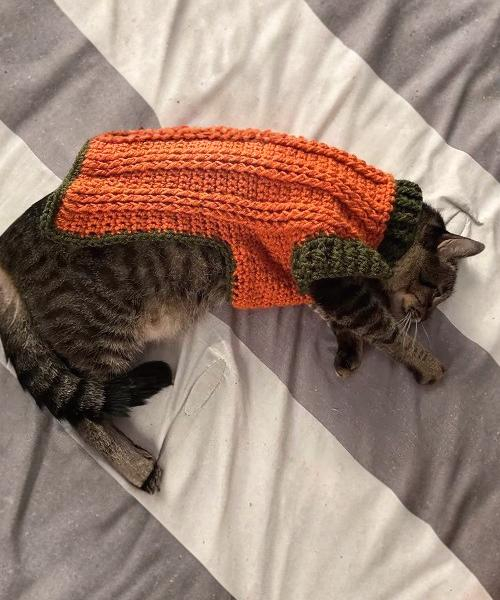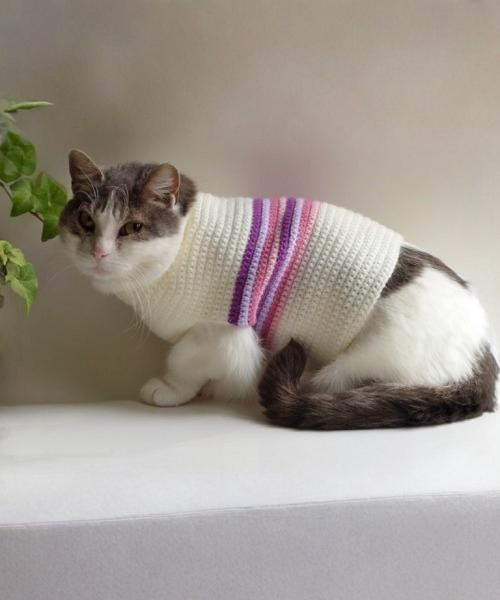 You can make this colorful and bright sweater for your cats from Mj’s off the hook. The whole pattern is made up of simple double crochet, an excellent choice for beginners.
