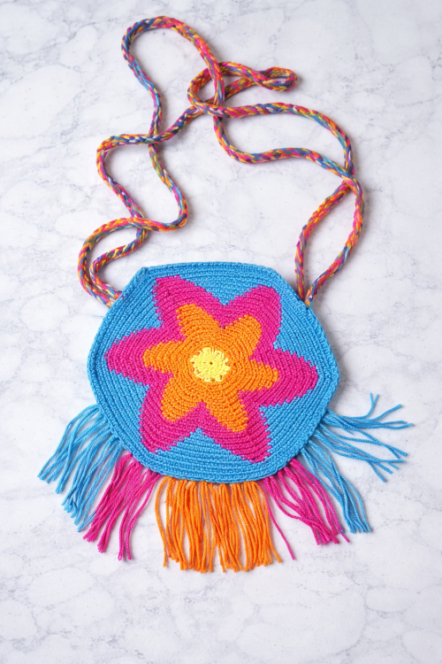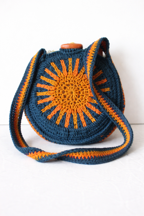 Divine Debris has designed this gorgeous crocheted purse. It features a bold starburst pattern in the center and colorful fringes at the bottom.