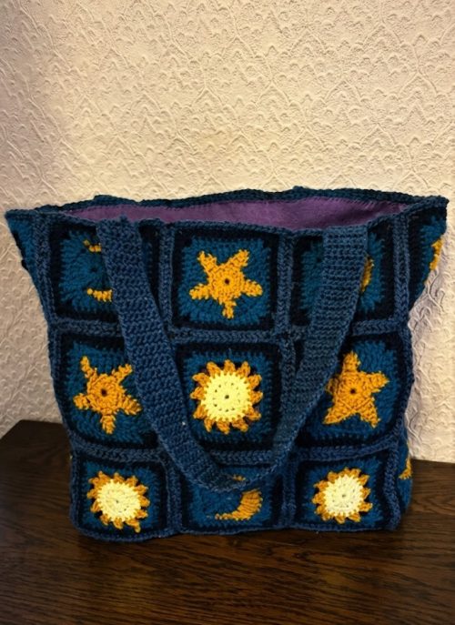Try your hand at this celestial tote bag by Stephanie Mitchard. The contrasting colors are the key elements of this design. All you need is DK yarn in different shades with a 4mm hook.