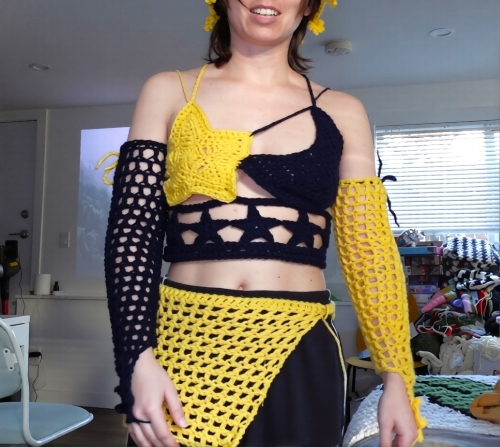 Vera Icona crocheted this sassy celestial-themed outfit by combining a bunch of granny pentagon squares. The star motifs in their center make it a priceless piece for handcrafted wearable lovers.
