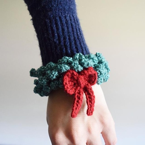 Love holiday wreaths? Then you must check out this wreath-shaped bracelet featuring a red bow. Lizette created it with a 3.5 mm crochet hook, medium-weight size 4 yarn, and a bent yarn needle.