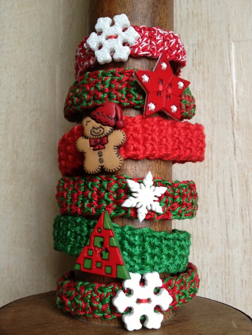 These crocheted bracelets by Kim Cole are 5/8 inch wide and 7-1/2 inches in length. All the bracelets have different Christmas-themed buttons and cabochons.