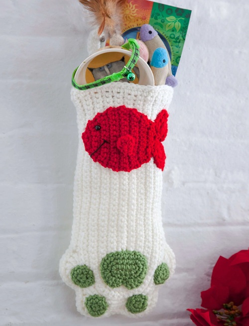 Yarnspirations gives a quirky twist to holiday decor settings with this cat paw Christmas stocking. You can easily stuff it with lots of treats and toys.