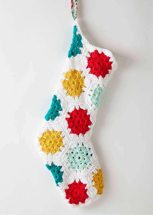 Alexis Middleton has designed this African flower hexagon stocking. All you require is worsted-weight yarn and a 5.0 mm crochet hook.