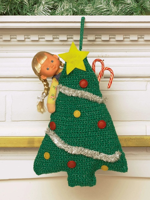 A crocheted stocking shaped like a Christmas tree is just what you need to make your living space stand out. The Christmas tree stocking by Yarnspirations is perfect for hanging by the fireplace mantel.