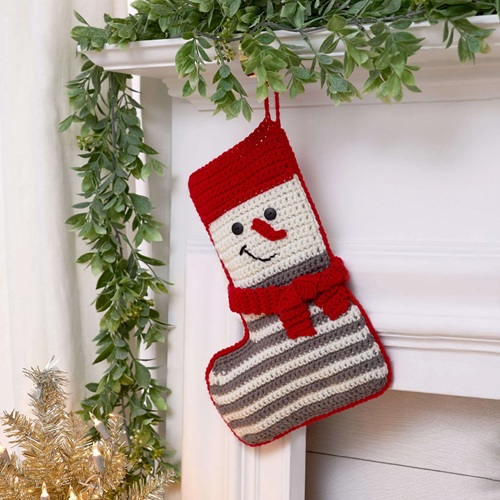 Shaped like a cheerful snowman, it’s perfect for hanging by the fireplace or your front door. It has a red scarf, which is crocheted separately. Go through Yarnspirations for step-by-step instructions.