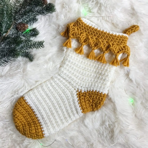 This stocking stands out with its textured bohemian look and cozy design. Its tiny fringes and non-traditional hue make it a unique piece. Nana’s Crafty Home has crafted it.
