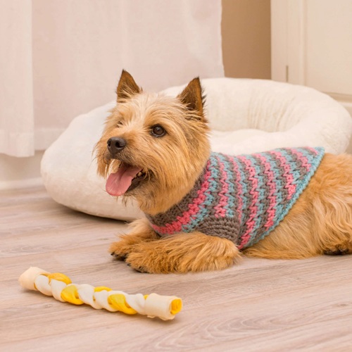 Keep your dog cozy on late evening park strolls with this lovely sweater. It’s thoughtfully designed by Yarnspirations to ensure complete comfort without restricting mobility.