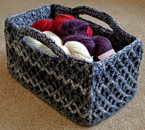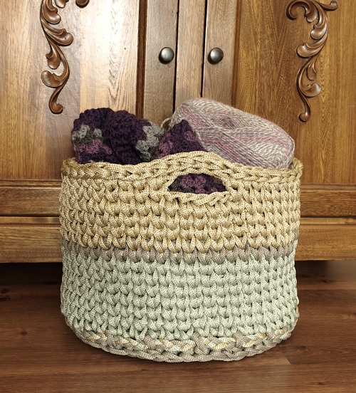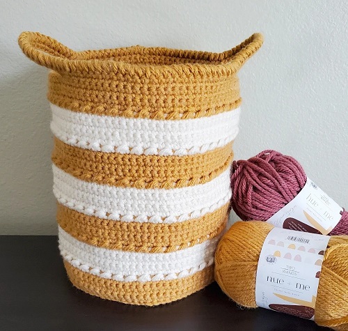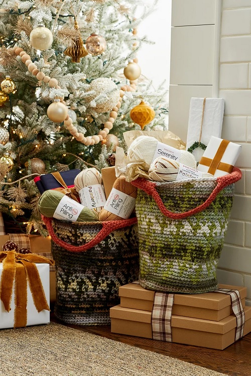 Check this beautiful basket from Premier Yarns. This looks cool, and the creator uses the tapestry method to change the colors. You can download the PDF that is completely free and make one for yourself.