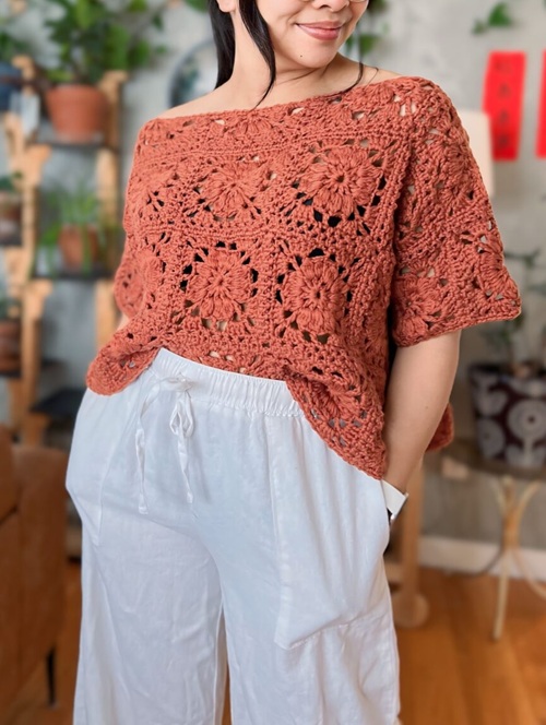 Do you know how to make modified French square motifs? If you’re smiling and nodding with a yes, Abigail’s summer top is just for you. It has a boat neckline and floral designs in the center of every square.