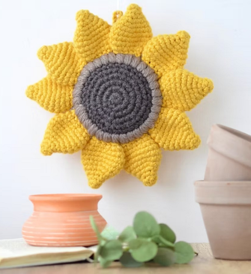 This bright yellow crochet sunflower is a stylish way to decorate your kids’ room. The finished size of the product is 11 inches in diameter. It includes very minimal materials like a hook, a yarn needle, and poly filling. By Elisa.