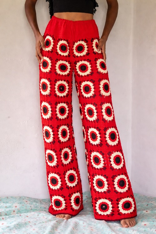 High rise and wide leg, these granny square crochet pants from Magnumopusarzu are a fashion statement in themselves! Stitched with vibrant sunflower motifs, they will bring a fresh, trendy appeal to your outfits. Have fun styling!