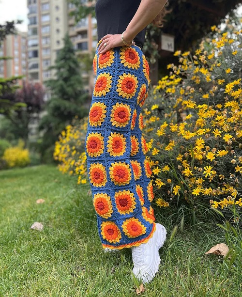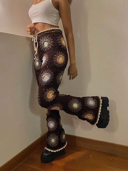If you love to make eye-grabbing wearables out of granny squares, this list is exclusively for you. It has a nice collection of floral-themed crocheted granny square pants in different designs and color combinations. Check them out!
