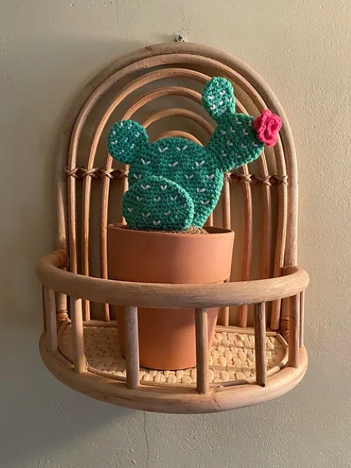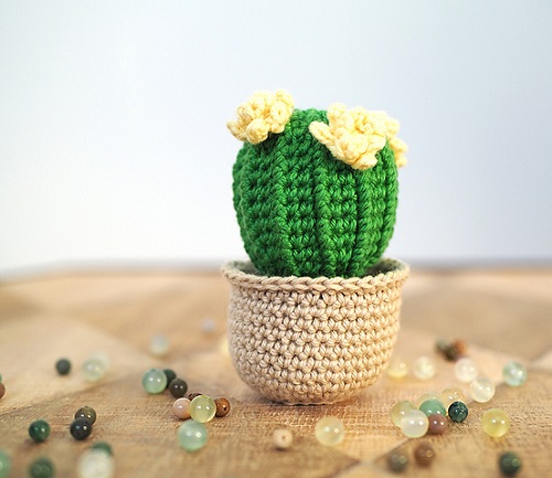 Add a poke-free cactus to your living space with this Nuria Álvarez’s crochet pattern. This barrel cactus with yellow blooms looks quite appealing.