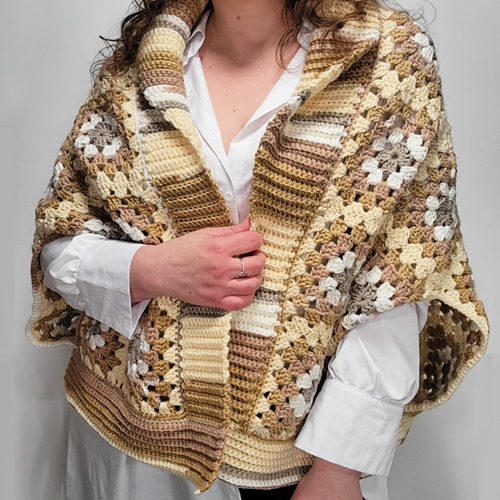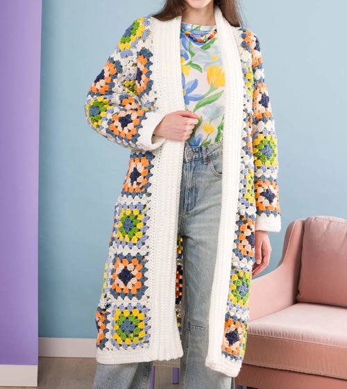 Stay stylish on brisk fall days with this granny coatigan (coat + cardigan). It’s worked in traditional granny square double crochet. Yarnspirations is behind this project.