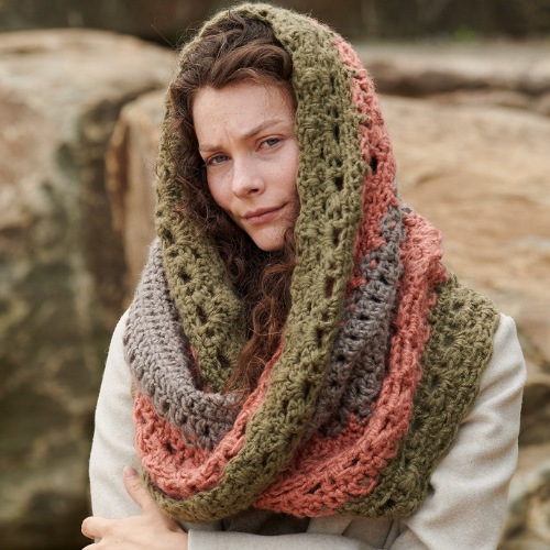 The famous Tamara Kelly designs this lovely cowl with a Mobius loop and foundation double crochet. It can be styled as a hooded cowl and in various other ways.