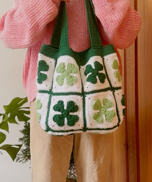 Have a look at this lovely clover bag by Tiny Crochet. The bag is designed using the granny square with 2.5mm cotton yarn and a 3mm hook.