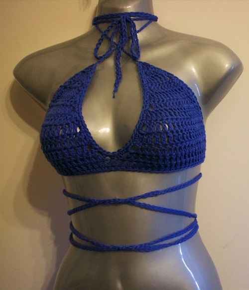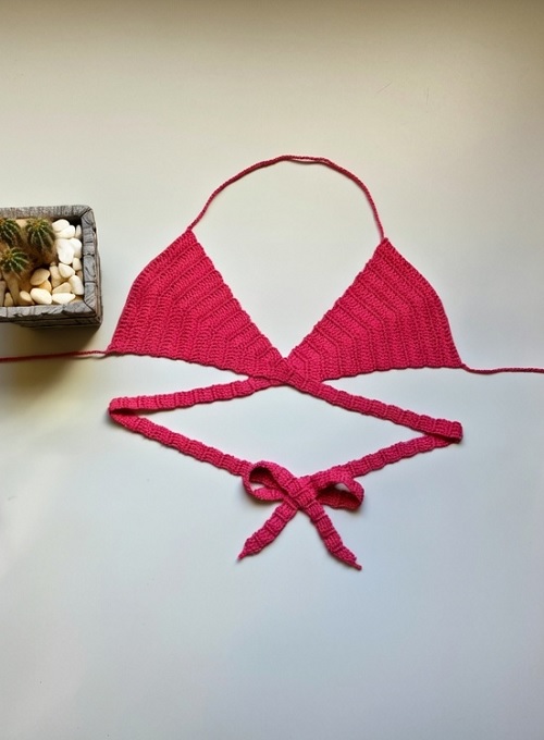With the help of a 5 mm crochet hook, size 4 worsted-weight cotton yarn, a pair of scissors, and a yarn needle, you can create this fashionable bathing suit top. Shared by Chasing SunRaee.Â