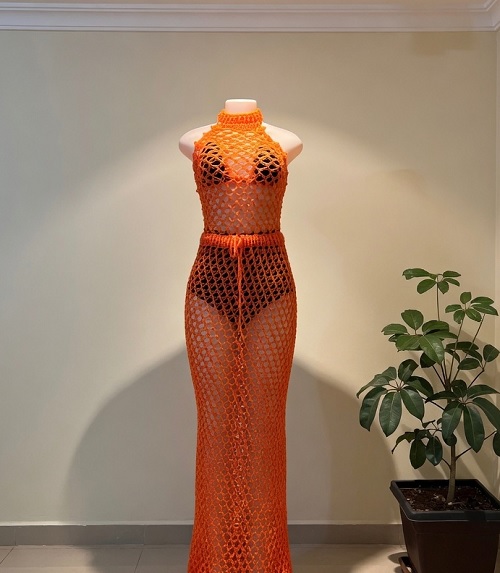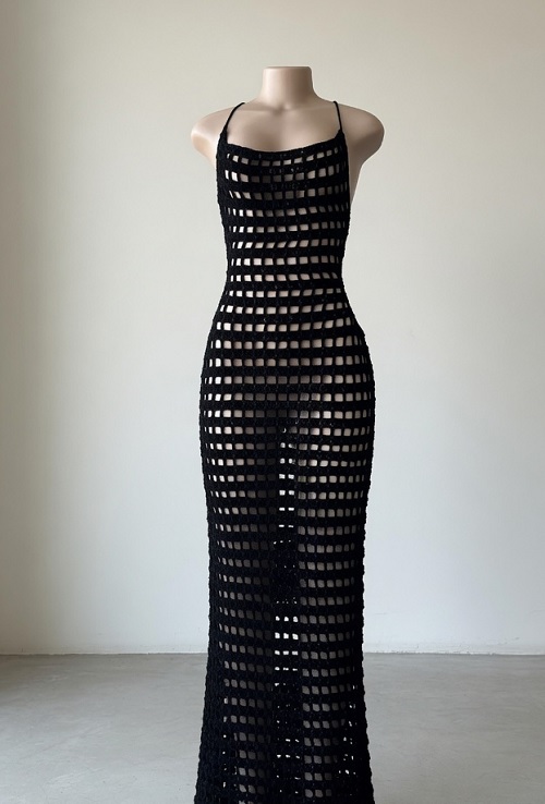 This maxi mesh dress is from AC Crochets. It used very minimal material, like yarn of any color and a 2.5 mm hook size, which means you can create a full-length garment using just a few skeins of your favorite lightweight yarn.