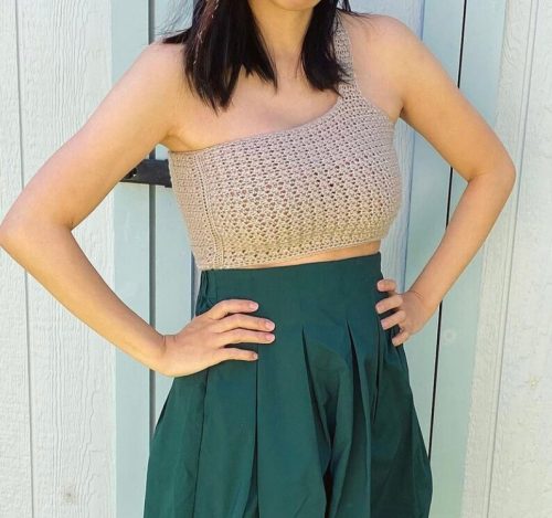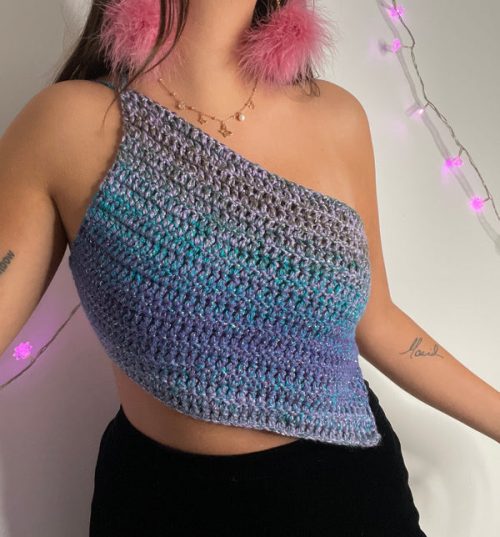 Try this crochet one-shoulder top from Jennyandteddy crochet. It uses only beginner-friendly stitches, so new crocheters can definitely go for this. You can make this at any size from S to 3XL.